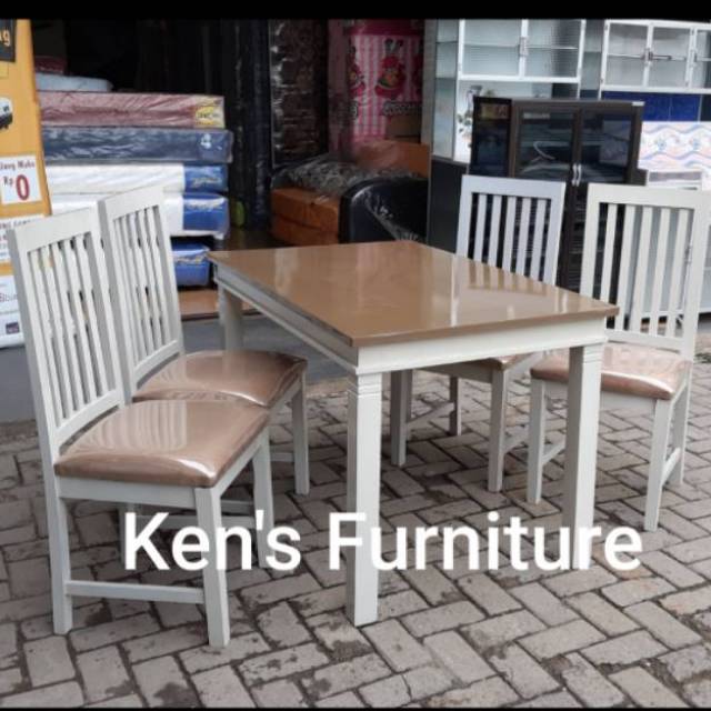 Meja Makan dengan 4 Kursi dengan bahan Kayu Mahoni , meja ditatakin kaca bening 5 mm Free Ongkir Wilayah Jabodetabek (diluar wilayah Jabodetabek mohon chat kami terlebih dahulu) Meja makan dilengkapi dengan 4 buah kursi, Bahan Kayu mahoni yang kuat kualitas pilihan dengan desain minimalis modern membuat ruang makan anda menjadi nyaman berkesan minimalis elegant, kursi dengan jok bahan oscar berkualitas serta meja dilengkapi dengan kaca bening setebal 5 mm supaya warna finishing meja tetap aman dan awet walau terkena tumpahan air atau kuah Ukuran Meja 77 x 122 cm Silahkan langsung diorder, selama iklan tayang selalu ready
