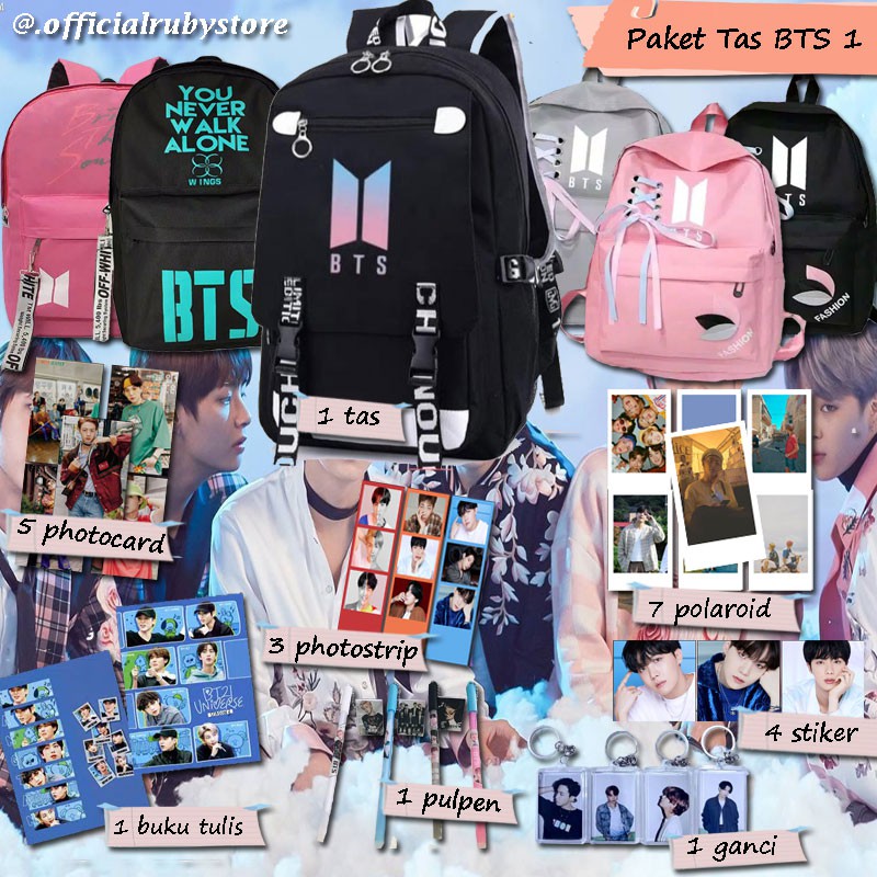 1 paket bakalan dapet:• 1 buah tas bts• 1 buku tulis• 7 polaroid art paper 230 gsm+ laminasi• 5 photocard art paper 230 gsm+ laminasi• 3 photostrip 230 gsm + laminasi• 4 stiker• 2 poster a5 art paper 120 gsm• 1 pulpen bts• 1 ganciKETERANGAN UKURAN:- Tas 130 cm x 40 cm x 12 cm- Tas 230 cm x 40 cm x 12 cm- Tas 330 cm x 40 cm x 12 cm- Tas 438 cm x 30 cm- Tas 5+- 38 cm x 29 cm x 14 cm- Tas 6+- 38 cm x 29 cm x 14 cmDengan membeli paket ini, kamu bisa hemat hingga 40 rb!!PO 7 hari tapi barang selalu dikirim sebelum hari ke-7.Printilan dicetak dengan art ink di atas art paper lalu dilaminasi! Kualitas selalu terjaga.Tambah packing BUBBLE WARP untuk keselamatan. Silakan cek etalase toko.Tunggu apa lagi? Order sekarang juga! #fankitbts #paketbts #pakettasbts #bts #army #tasbts #taskpop #fankit #kpop #printilanbts #printilank