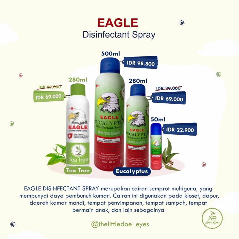 NOTE: KHUSUS LUAR PULAU JAWA, mohon maaf belum bisa untuk luar pulau jawa karena, RESIKO barang nyangkut selama 2 minggu dan ongkir hangus apabila barang tidak lolos scan bandara)Pengalaman yang sudah2 selalu tidak lolosMommies..Cuaca yang lagi gak bagus seperti sekarang cepet banget buat kuman, bakteri dan virus berkembang biak. Kita yang beraktivitas dari luar pasti membawa banyak bakteri, kuman, dan virus masuk ke rumah. Belum lagi udara atau angin yang masuk kedalam rumah dapat sekaligus membawa bakteri dan virus yang menyebabkan penyakit..Pastinya hal tersebut gak mau dong terjadi pada rumah dan keluarga kita jadi moms, perlu banget deh memstrilkan ruangan setiap rumah dengan Cap Lang Eagle Eucalyptus Disinfectant Spray✨✨ Cairan semprot multiguna, mengandung minyak Eucalyptus Globulus yang terkenal mempunyai daya membunuh kuman. Minyak Eucalyptus Globulus dibuat dengan cara destilasi uap dari daun-daun serta pucuk-pucuk ranting pohon Maleulucae Globulus...Caranya semprotkan secara merata ke dalam ruangan seperti daerah kamar mandi, dapur, tempat penyimpanan/ruangan, Gagang telepon, Tempat pembuangan sampah, tempat bermain si kecil, ruang tamu, kamar tidur, dalam mobil, kloset, dll...280mlExp 2025#caplang #eaglebrand #eagle #caplangeagle #eagleeucalyptus #caplangeucalyptusspray #eagleeucalyptusspray #airdisinfectantspray #disinfectant #eagleeucalyptusspraybandung #eagleeucalyptusspraymurah #eagle