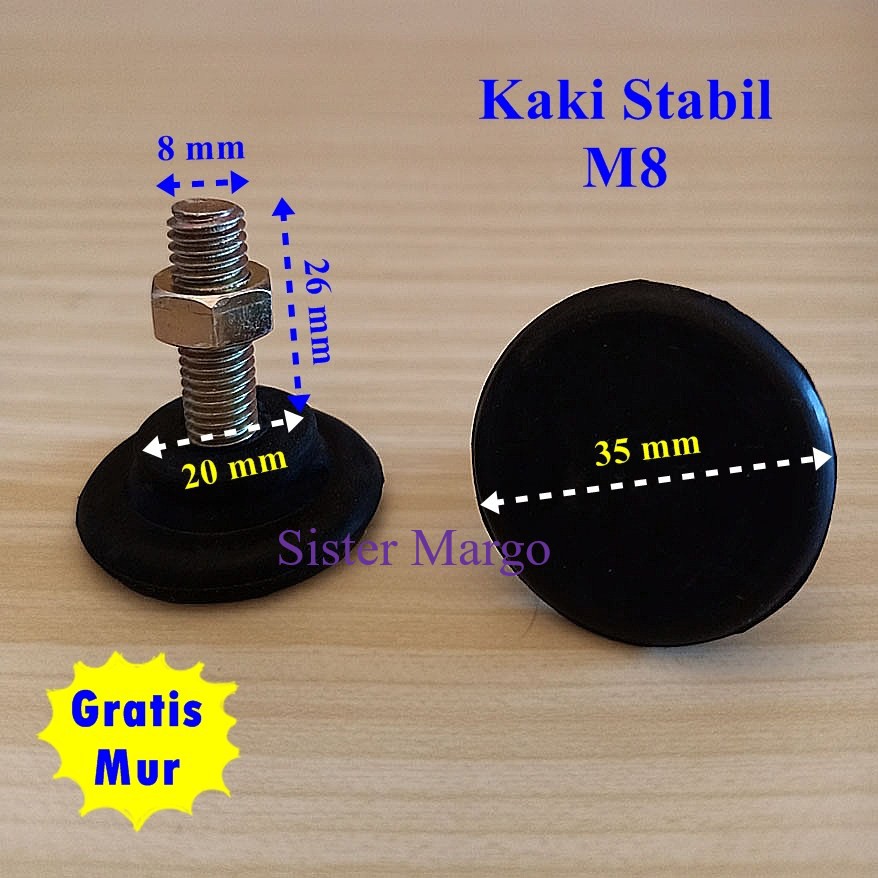 Deskripsi Kaki Stabil Alas Kaki Kursi Meja M8Kaki stabil atau adjustable food untuk alas kaki kursi meja ukuran M8 berfungsi sebagai pengaman agar lantai tidak tergores. Dan melindungi furniture dari lembab.1 Paket Isi 4 PcsGratis MurBahan: Karet AlamUkuran:Diameter 1= 35 mm / 3,5 cmDiameter 2= 20 mm / 2 cmPanjang drat= 26 mm / 2,6 cmJika memerlukan ukuran lain bisa lihat etalase k
