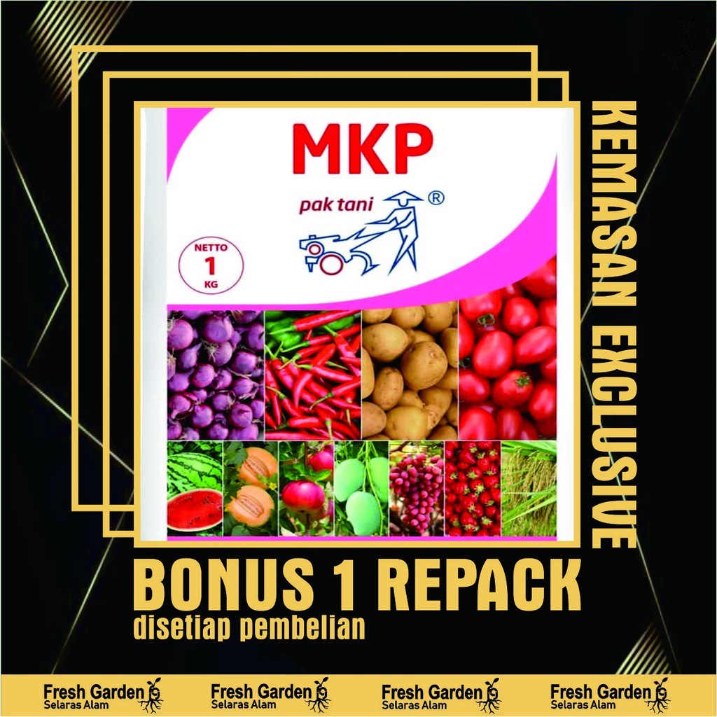1 bks isi : 50 gramMerek : Pak TaniMKP ( Mono Kalium Phosphate ) merupakan pupuk kimia dalam bentuk kristal yang mudah larut dalam air, aplikasi mudah dengan cara ditabur, dikocor/disiram, disemprotkan atau sistem hidroponikKeunggulan MKP Pak Tani :1.Merangsang pertumbuhan akar2.Merangsang pembungaan 3.Merangsang pertumbuhan buah 4.Mencegah bunga dan buah rontok5. Membantu pembesaran umbi pada tanaman kentang, wortel, bawang merah, talas dll 6.Meningkatkan daya tahan tanaman terhadap serangan penyakit7.Meningkatkan kualitas buah Pupuk MKP bisa digunakan sebagai nutrisi hidroponik karena bersifat mudah larut (instan soluble) dan tidak meninggalkan endapan.•pemakaian MKP Pak Tani 1% ( 10 gr / liter air ) yang dicampur dengan fungisida sistemik dapat meningkatkan efikasi fungisida terutama dalam mengendalikan powdery mildew pada tanaman apel, melon, semangka, mentimun, anggur, stroberi dan mangga•cocok digunakan untuk semua jenis tanaman : padi, jagung, semangka, melon, cabai, tomat, mentimun, tanaman hias, palawija, tanaman perkebunan serta tanaman yang ditanam di green house / hidroponik Aplikasi : mulai menjelang pembungaan ( fase generatif ) Kandungan unsur hara pada MKP Pak Tani : P2O5 ( Phosphate ) : 53% K2O ( Potassium Oxide ) :