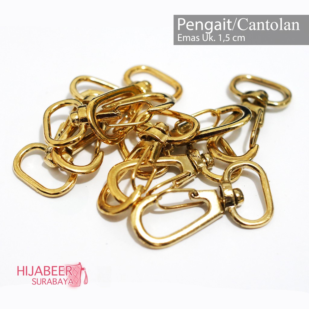 Pengait atau biasa juga disebut cantelan atupun cantolan ini biasa digunakan untuk menjadi kait penyambung tali tas atau hanya digunakan untuk gantungan aksesoris tas dan bisa juga digunakan untuk gantungan kunci. Kait ini terbuat dari nikel dan memiliki banyak fungsi dalam kerajingan tangan rumahan maupun produksi besar.Kode barang : CPM001-5Diameter lubang atas : 1,5cmPanjang : 3,8 cmWarna : EmasKualitas terbaik!Harga yang tertera untuk 1