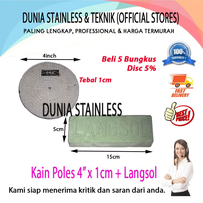 langsol sabun hijau untuk poles stainless steel agar terlihat bersih kembali.Kain Poles digunakan unutk membuat bahan stainless menjadi kilap lagi.Untukdimesin gerinda dan dinamo.NB: Pembelian dengan invoice diatas 5 juta, akan mendapat harga khusus dan pengiriman bisa melalui jalur udara, darat & laut. (Berlaku untuk semua