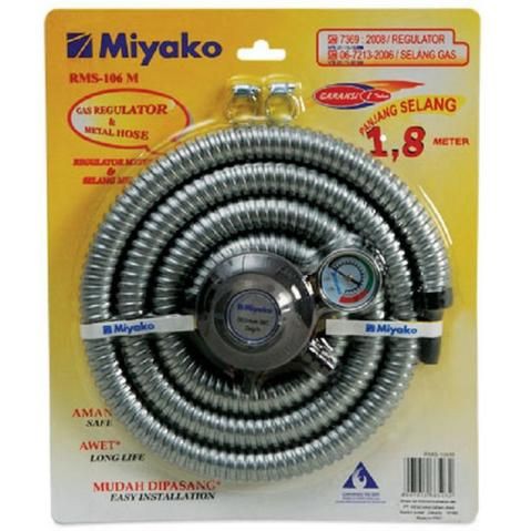 Selang dan Regulator MiyakoTipe RMS 106Spesifikasi :1. Selang 1.8 meter berlapis stainless steel2 . Regulator Meteran3. cin-cin pengaman 2 biji4. Garansi resmi 1