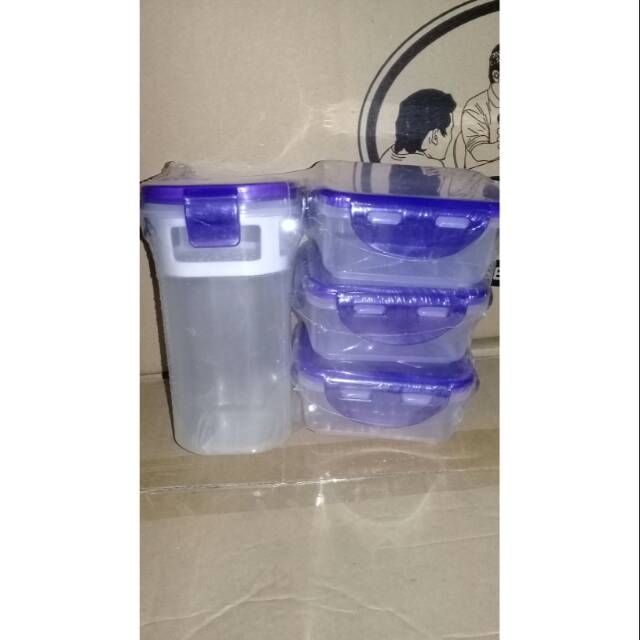 Smart Mom Candytuft Set of 4, tempat penyimpanan makanan dan minuman yang memiliki ciri khas, yaitu sistem penutup di ke-empat sisinya.Dilengkapi dengan seal karet pengaman, sehingga tidak mudah tumpah dan makanan tersimpan dengan aman.Di tempat minumnya pun terdapat penyaring di bagian atas yang bisa Anda gunakan untuk menyeduh teh.Terbuat dari bahan plastik PP5, BPA Free, dan FDA Approved yang aman untuk segala jenis makanan.Smart Mom Candytuft ini berwarna bening, sehingga memudahkan Anda melihat bagian dalam serta tutup berwarna ungu yang eye catchy.Smart Mom Candytuft Set of 4 terdiri dari :- 3 Pcs tempat penyimpanan makanan, kapasitas 200 ml- 1 Pcs botol teh, kapasitas 4