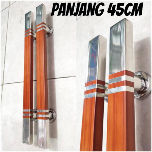 handle pintu stainless 45cm warna coklat kayu. panjang 45cm lebar 3cmsudah dilengkapi sekrup.harga tersebut isi sepasang (2 pega