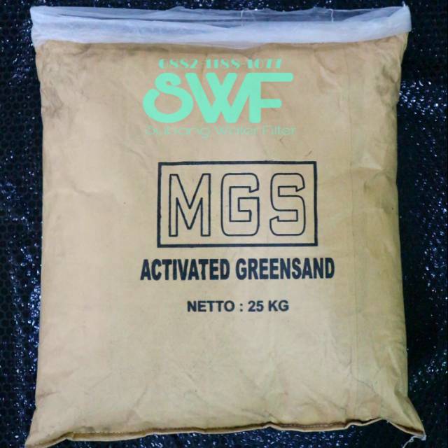 Fungsi Manganese greensand adalah untuk menghilangkan kandungan Mangan (Mn2+), Besi, Hidrogen Sulfida yang tampak seperti lapisan atas berminyak di dalam air minum atau air tanah atau air PDAM atau air gunung.Mangan Greensand adalah pasir khusus yang dilapisi dengan bahan katalis. Mangan Greensand menggunakan lapisan ini untuk bereaksi dengan zat besi, mangan dan hidrogen sulfida di dalam air dan membentuk endapan yang kemudian terperangkap dalam media filter.Mangan Greensand harus diregenerasi dengan kalium Permanganat (KMnO4) untuk meremajakan lapisan kembali. Kami selalu menganjurkan agar pelembut air (softener) dipasang setelah filter untuk menghilangkan Ferrous Bikarbonat (FeCO2) yang lolos dari filter. Mangan Greensand juga akan menghilangkan sejumlah Hidrogen Sulfida.Mangan Greensand mampu mengurangi zat besi, mangan dan hidrogen sulfida dari air melalui oksidasi dan filtrasi. Besi dan mangan yang terlarut teroksidasi oleh kontak dengan oksida mangan tinggi pada butiran greensand.Hidrogen sulfida dikurangi dengan cara oksidasi menjadi endapan belerang terlarut. Endapan ini kemudian disaring dan dihilangkan dengan cara backwashing. Ketika kapasitas daya pengoksidasi media Mangan Greensand habis, maka media ini harus diregenerasi dengan larutan kalium permanganat encer (KMnO4) sehingga memulihkan kemampuan oxidasi. 1 sampai 2 ons kalium permanganat dalam larutan per 30cm kubik Mangan Greensand dianggap cukup untuk regneration normal.Tersedia kemasan 25kgBarang selalu ready
